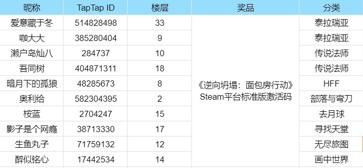 以下是上周《逆向坍塌:面包房行动》的愿望单抽奖活动的中奖名单,管理员将主动联系各位中奖的玩家,大家不要忘记加入官方群领取自己的奖品哦!