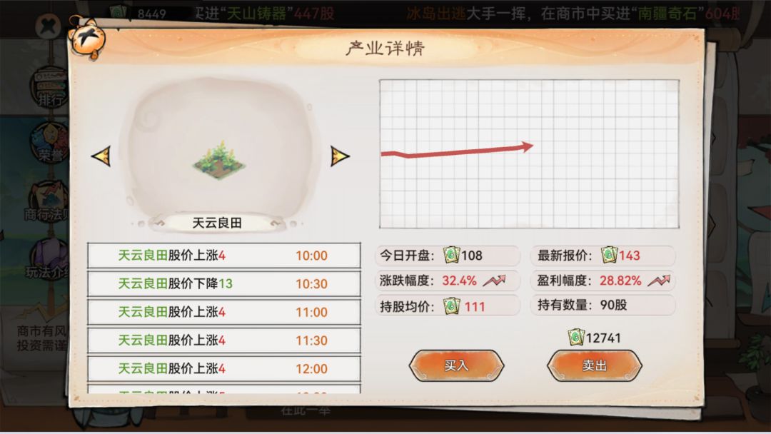 如果想要稳定获得股票,可以选择像第四张图的天云良田这种相对平稳上涨的股票,购入适当的股票,作为后备储存。