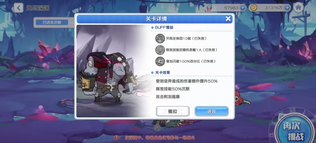2、”释放技能随机吞噬一人“这个buff看情况打,深渊的怪物首回合都是有携带【钢化盾】(免疫控制二效果)的,首回合要么靠部分控制少女的概率破盾,要么就依赖减能让boss放不出技能,但boss只站在后排,如果它有队友的情况下,减能就难以实现了,【实验战士】只吸前排,首回合碰不到boss,所以在只有boss一只怪物,并且我方【实验战士】和【闪电流星】高星的情况下可以不打这个buff。