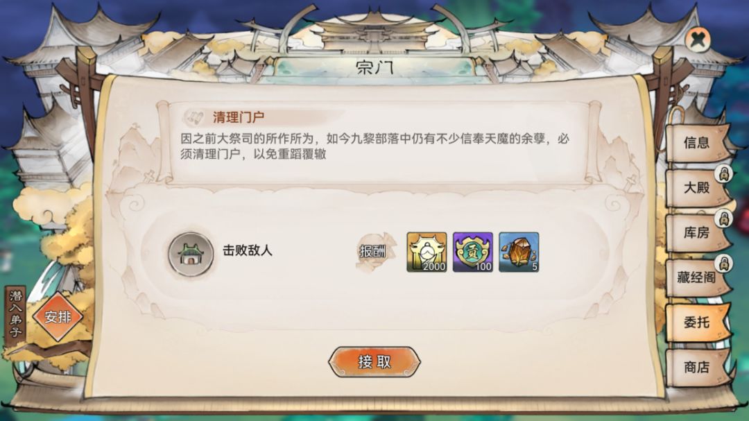 首先祖师可以优先完成宗门的委托任务,委托任务比较简单且获取的声望值也较多,而宗门贡献则可以先存起来待声望等级起来后,前往宗门商店换取提升六维和增加弟子天赋的珍稀道具