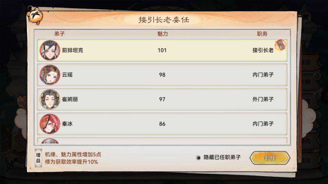 而赠礼获得的声望值与接引长老的魅力值有关,为了能获得更多声望值,我们需准备一名魅力值较高的弟子作为接引长老