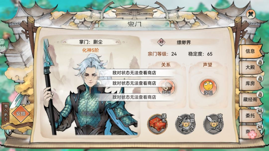 值得注意的是进行赠礼的宗门不宜进行该宗门弟子的策反和抓捕,有概率变成敌对,会导致无法完成委托和进入商店