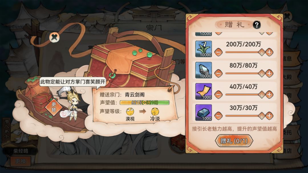 虽然每天每个宗门都可以进行一次赠礼,但赠礼所耗费的基础资源较多(赠礼需要达到一定数值后声望值才会增加,所以一次性拉满可以避免浪费),建议大家优先赠礼一个或几个宗门,资源多到没处用的大佬当小清瑶我没说。