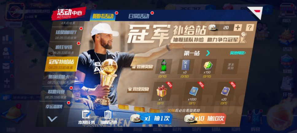 快来参加冠军游行,完成本期任务,获取冠军帽,用冠军帽换取冠军补给,升级球队默契!经理人可消耗1个冠军帽抽取1次补给,奖励中包含普通奖励和高级奖励,当获取本站全部高级奖励后将解锁下一站奖池!