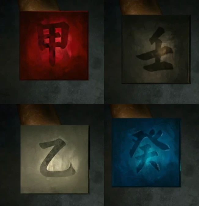 那么对应到卡片上,左上角和右上角都有的是癸,也就是左上角是癸也就是蓝色;左上角和右下角都有的是甲,也就是右上角是甲也就是红色;左下角和右上角都有的是乙,也就是左下角是乙也就是白色;左下角和右下角都有的是壬,也就是左下角是壬也就是黑色,都摆上去就获得了卡片。