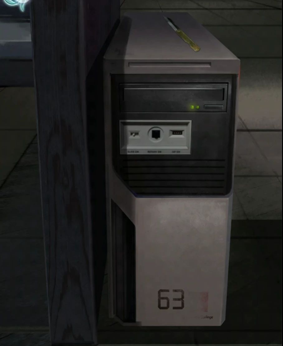 男主归队后就能进入包厢了,对门使用我们拼好的小卡片就可以了,先拿一下东西,中间位置的两个小木偶柜子抽屉拿到紫光笔,不就是解密神器紫外线笔么!电脑机箱位置拿到一把小刀,注意机箱上有号码63号,这就是一会我们要开机的电脑了,出门到吧台输入63给电脑开机,开机后回到包厢。