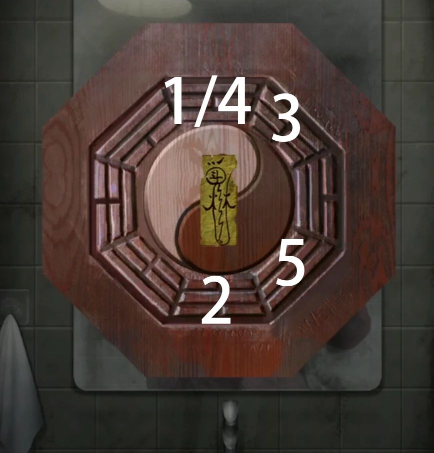 但是这时候如果我们想直接去包厢也是不行的,会提示我们先去救男主,行叭那先去厕所对镜子使用镇坛木,然后放上八卦盘,点击一下八卦盘后使用黄符,然后点击对应位置黄符会自动过去,五个位置都对即可解放男主,主要是不解放他剧情没法继续啊。