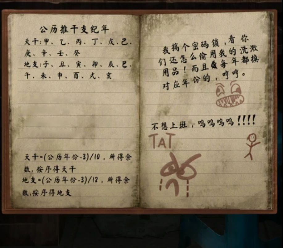 这里先说一句怕后面忘记了,在网吧的左下角那排电脑旁边有个黑色小方块,从吧台能点到后面的神龛,挪开神像后有蓝色小方块,如果卡关的小伙伴记得拿一下,打开吧台电脑下面的笔记本是密码锁的线索,先根据左上角的手机点一下提示现在是2010年,那么天干=(2010-3)/10=2007.07,数一下天干的第7个是庚记下来,地支=(2010-3)/12=167.25,数一下地支的第25个是子,所以密码是庚子,但是注意了!密码是庚寅,感觉是设置错误吧,总之输入庚寅打开储物柜,挪开下面红色水桶拿到红色方块,后面还有一张线索纸。