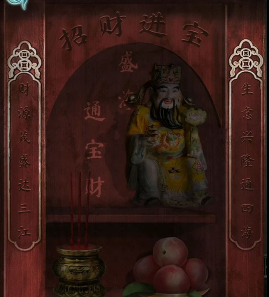 出门先解决神龛谜题,看一眼神龛,中间的盛海通宝财几个字和旁边对联都有相同的字呢,所以合理猜测我们需要将箱子上相同的字都按下去,左侧相同的是第1个和第4个,右侧相同的是第5个和第7个,横批相同的是第2个和第4个。