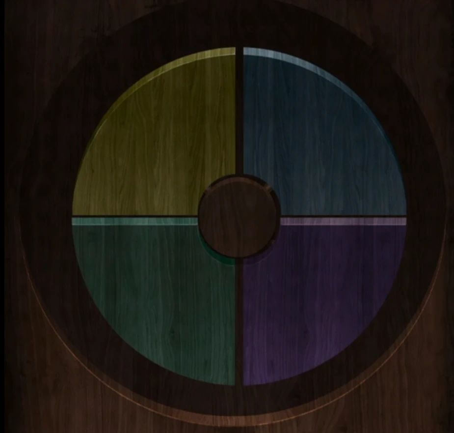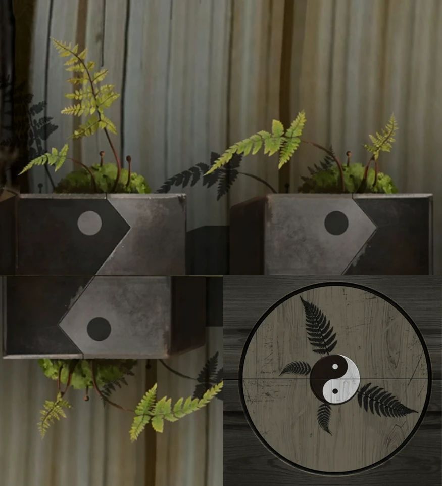 下层有个八卦叶片小机关,对话就已经提示了和上面的盆栽一样,查看一下柜子上层果然有个盆栽,盆栽也是分为大小叶片的,盆栽一个是黑在左侧一个是黑在右侧,也就是右侧的盆栽需要倒过来看的,所以米雪就给顺时针转一下方便小伙伴们看吧,调整八卦叶片到同样位置即可打开拿到白色碎片。