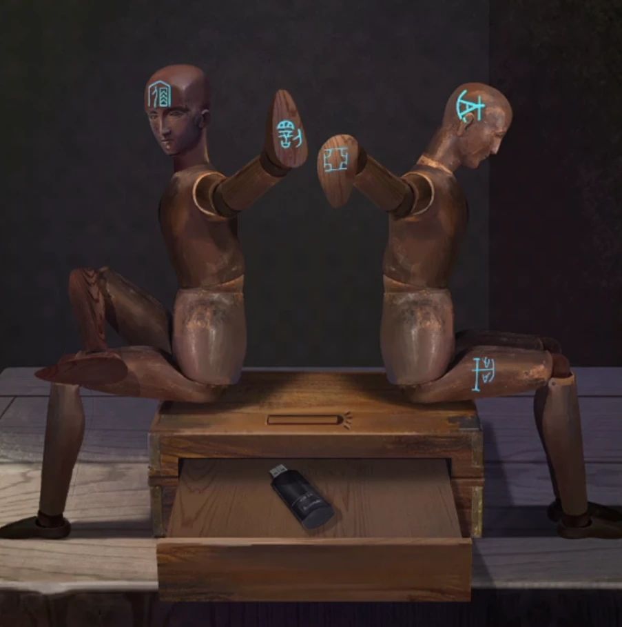 对左侧沙发上特别明显被缝过的抱枕使用小刀后获得人偶头,对右侧柜子上的两个人偶使用头,然后对人偶使用紫光笔,发现人偶不同动作会露出不同的文字来,那么就调整一下人偶身上的文字,让文字和论坛主页的鬼画符一样就能打开暗格拿到一个u盘了,对电脑机箱使用u盘后查看显示器就能继续剧情了,本章结束。
