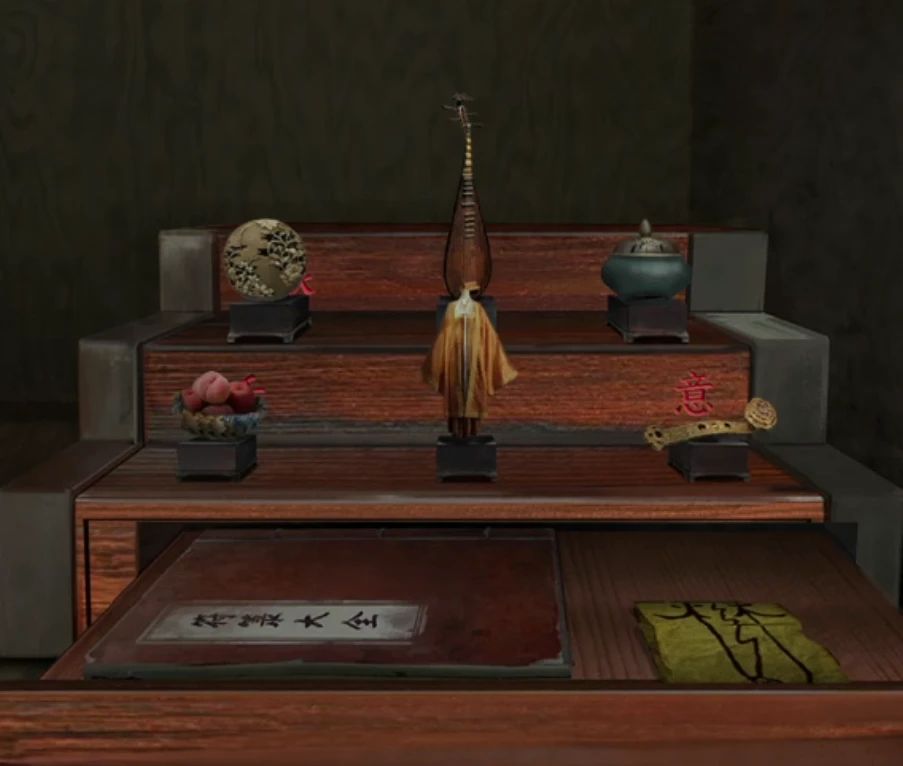 右边的柜子中间位置有个三层的架子,提起每一个物品就能看到后面写的字了,那么第一个眼对应镜子,第二个耳对应乐器,第三个嗅觉是香,第二行的味觉吃的,身上穿衣服,右下角玉如意不就是意了,调整一下顺序打开暗格拿到符纸。