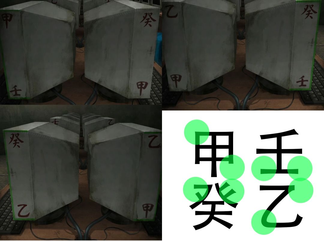 我们还能注意到小册子有很多绿色方块,那么有类似东西的就是外面显示器了,查看一下左下角,左边中间,右边中间只能点到桌子的那一排这三排机器,就能看到甲的左上角和右下角有绿色,乙的左下角和右上角有,壬的左下角和右下角有,癸的左上角和右上角有,画个图就是如下图。