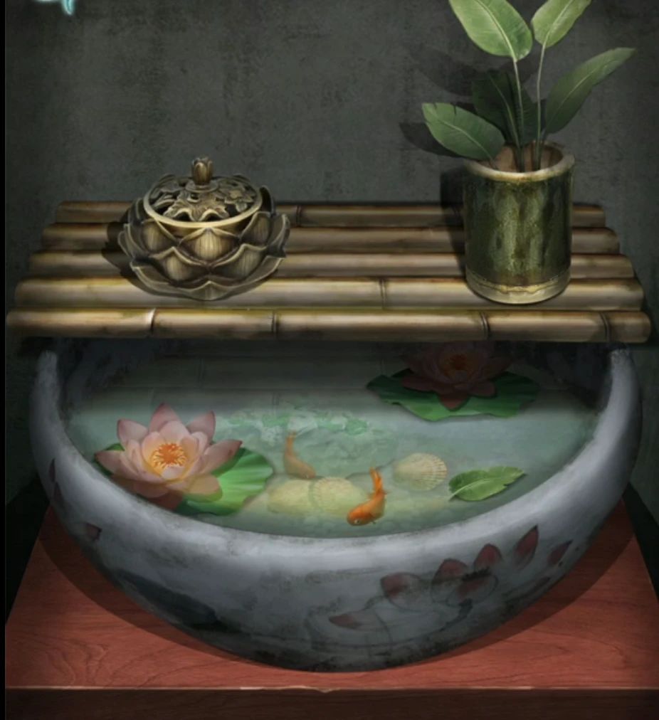 出门继续看吧台,后面神龛的下层的线索是荷花-叶子-贝壳,那么观察一下吧台后面的水景盆,有2朵荷花,6片叶子(水里还有一片),3个贝壳,既然不是连续的数字那么就是点击次数了,也就是荷花点2下,叶子点6下,贝壳点3下,完成后柜子打开拿到八卦盘。