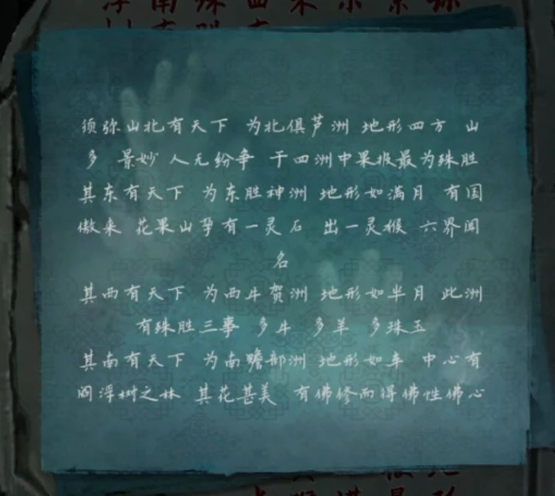 从密道下楼到地下一层,因为剩下解谜都在这里就不给它起名字了,在中间位置有一个石碑,查看一下是几个地理位置,再查看一下右上角的石灯顶部,不过我们不知道方向可以先放一下,如果实在没说就上北下南左西右东了。