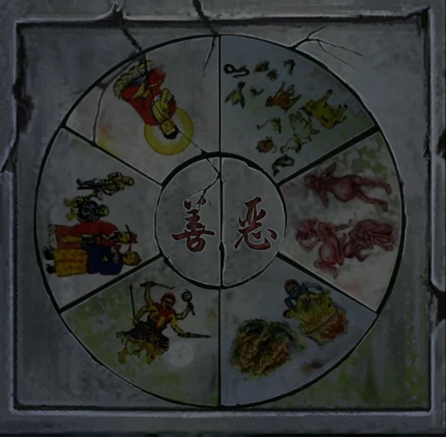 线索太简单就不截图了,一句话就是善从上到下天-人-修罗,恶从上到下畜生-恶鬼-地狱,按照这个去调整右边的机关,左边是善右边是恶,调整完毕后自动切换到上面图案,看来果然还是需要上北下南左西右东啊~