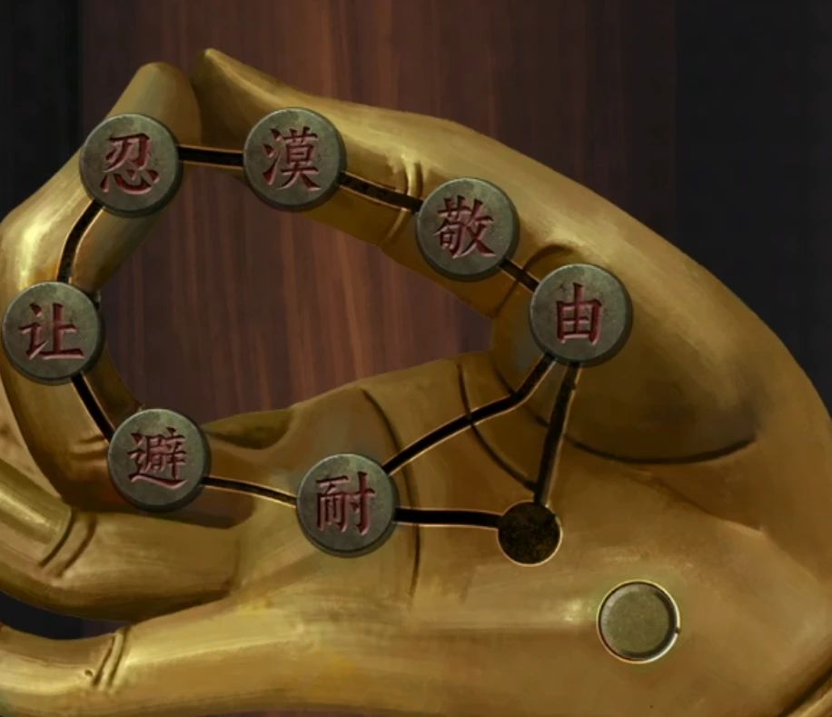 一层没有可以解谜的了,那就从二层一堆佛开始,先来调整一下右边佛像手里的谜题,从中指最顶端按照顺序是忍-让-避-耐-由-敬-漠,解密过程前面有哦,利用右下角空着的那个来调整一下顺序,调整完毕后拿到另一只手的文殊兰木片。