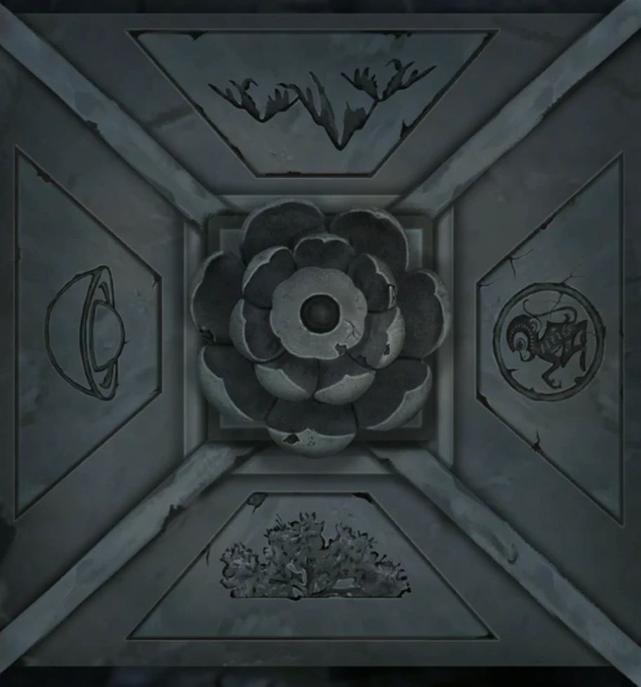 放好后中间升起了个台子,查看一下中间位置是五个花型,看起来有点眼熟,根据前面我们说太麻烦后面一起说的图案和旁边对应的黑色方格位置,再结合一下小小的排除法,调整一下就能打开了,在下面打开的盒子放入木鱼眼睛拿到玉筒,旁边的书简就是新的线索。