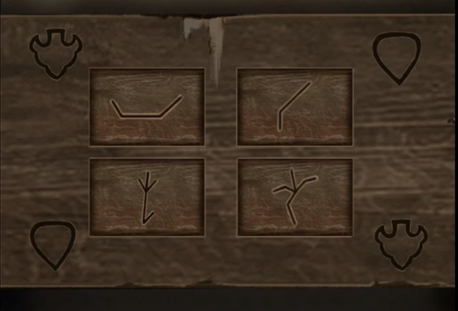 这里吊饰的位置是固定的,我们只需要确认几个图案和吊饰的相对位置,像小人的在奇怪吊饰左上角,像碗的在奇怪吊饰右下角,拐杖在心形吊饰左下角,小树枝在心形吊饰右上角,所以按照这个相对位置来到四楼调整一下右边的盒子,打开拿到娑罗花木牌,后面纸条就是接下来的任务目标了,找阳火和七星灯,后面还有一张小纸条别忘了拿。
