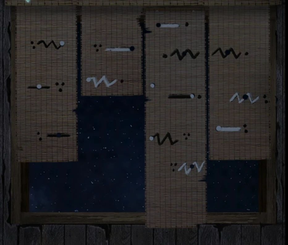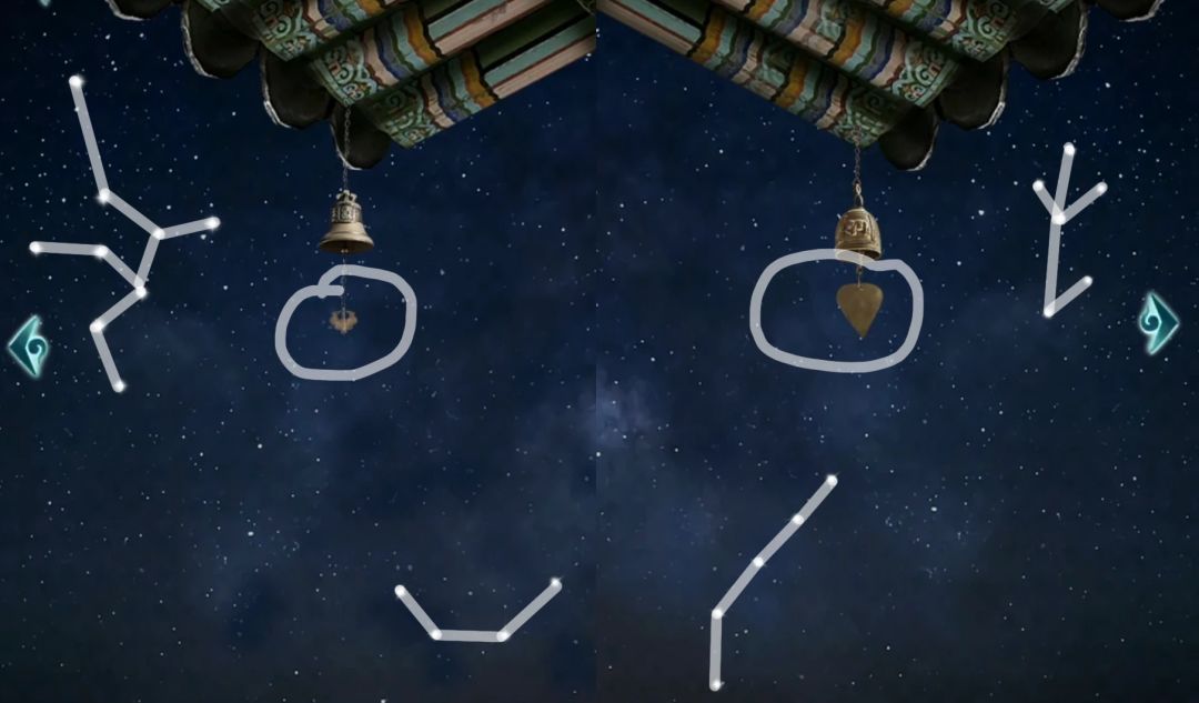 再次来到五层右边的窗子可以看星星,有两种星星,结合四楼柜子上的图案做个连线就能看出来都是什么形状了,这里注意铃铛的吊饰也是不同的哦,一个是心形,另一个是比较奇怪的形状,我们要把吊饰的位置也给加进去的。