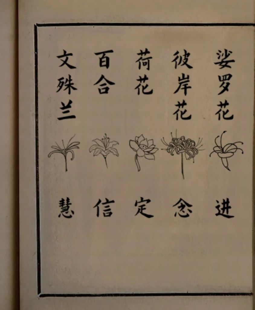 书上第二页有几种花的图案和对应的字,这里看一下后面会用到,第三页提示从大拇指到小拇指对应的是信-精进-念-定-慧,也就是说从大拇指到小拇指对应的花是百合-娑罗花-彼岸花-荷花-文殊兰,还是先记下来后面用。
