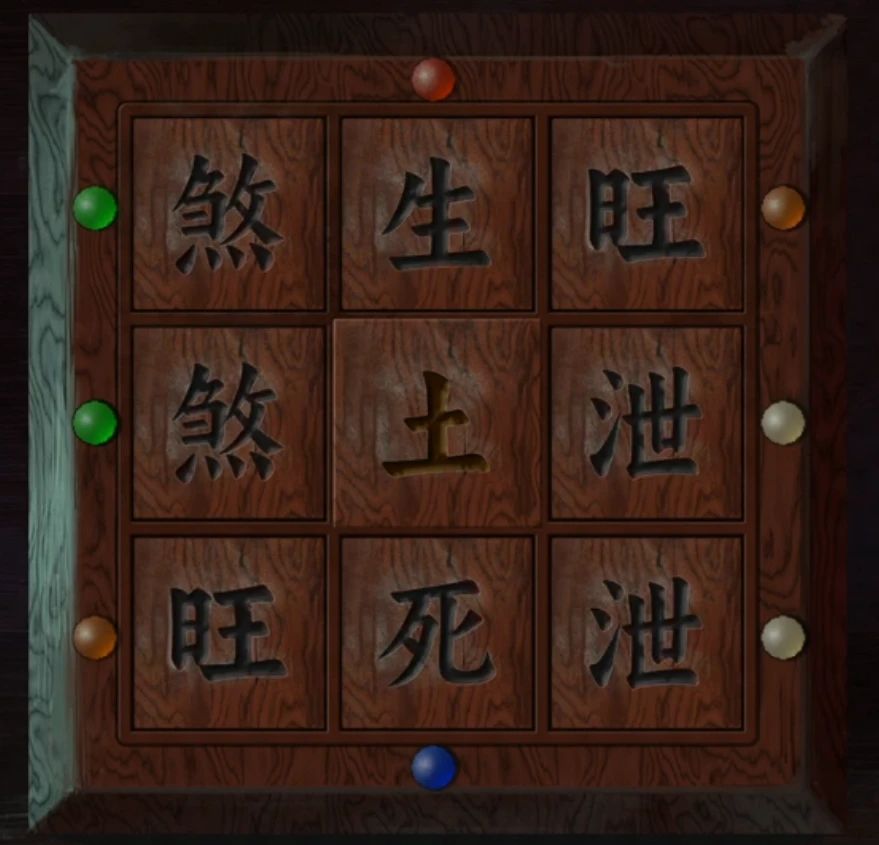 回到三层查看一下右边的柜子,中间位置的小盒子对照着调整,根据前面我们的推理绿色=煞,橙色=褐色=旺,红色=生,白色=泄,蓝色=死,调整完毕打开拿到百合花木片和阳火,既然有了灯和阳火我们可以先去一层了。