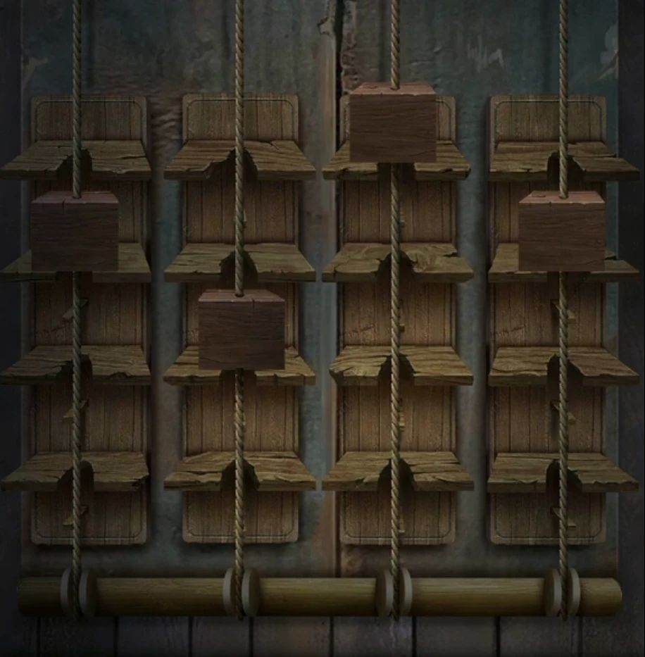 注意后面挂着的佛字右下角有个图案,这个我们放在最后用到的时候再说,因为很久怕一会就忘干净了!继续往上走到达楼顶,对正面的鹰爪子使用玉佛后就获得了玉鸟,左侧有个小木块机关,在左侧窗帘的下面画了一个图案,随便挪动一下小木块就会发现这个和左边窗帘是联动的,先随便挪动一下拿到窗帘左下角的彼岸花木片,然后将木块放到如下图高度就能让窗帘和图案高度相同了。