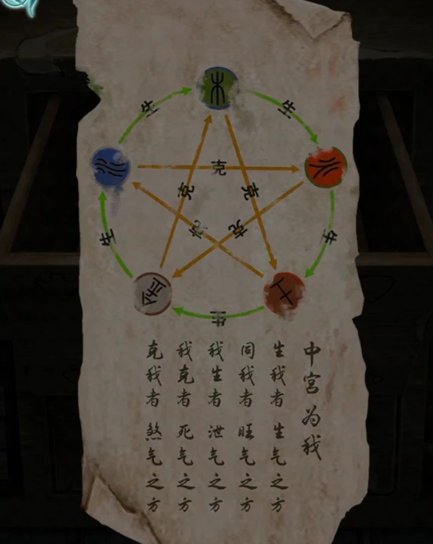小纸条的提示是楼下的盒子提示,中间位置是“我”,我们已知中间是土了,那么火生土,火=生;同我就是土,土=旺;土生金,金=泄;土克水,水=死;木克土,木=煞,这样就获得了盒子的文字对应,然后看一下对应颜色,木=绿色,火=红色,土=褐色,金=白色,水=蓝色。