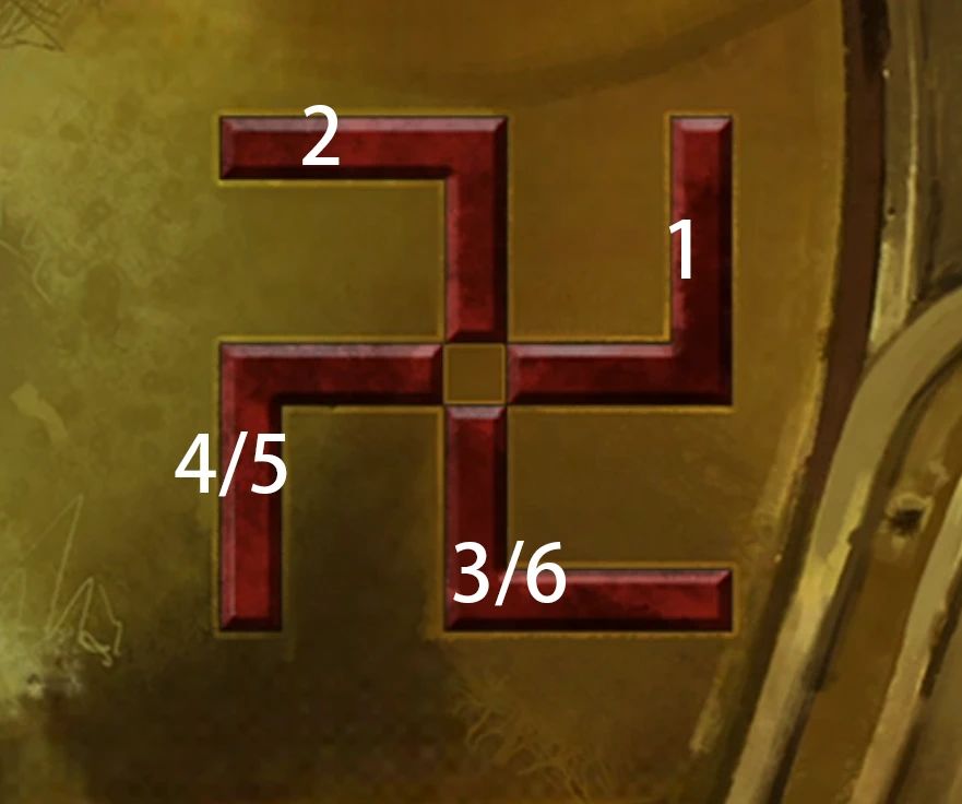 再看一下中间的那个佛像,根据我们前面推理出来的顺序┘┐└┌┌└,对应到胸前就是右-上-下-左-左-下,按照顺序点击完毕后获得他手里的钵盂,这时候我们一楼的物品也都齐了,下楼将三个物品都放在佛像手中,中间那个是钵盂,然后在佛像左边也就是我们右侧的那个是塔,在佛像右边也就是我们左边的是莲花,放好后露出新的暗格。