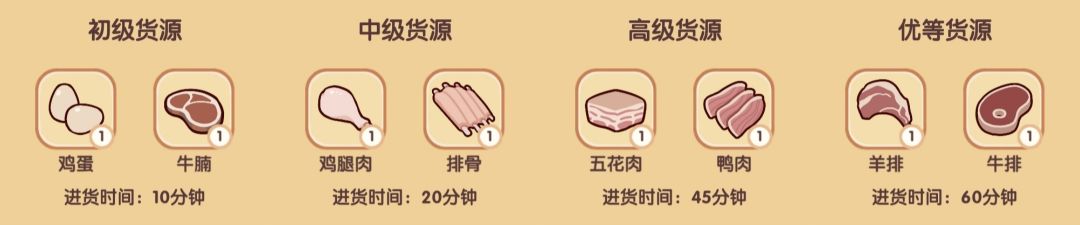 (解锁新菜谱后,进货处可点击左右箭头切换肉类材料)