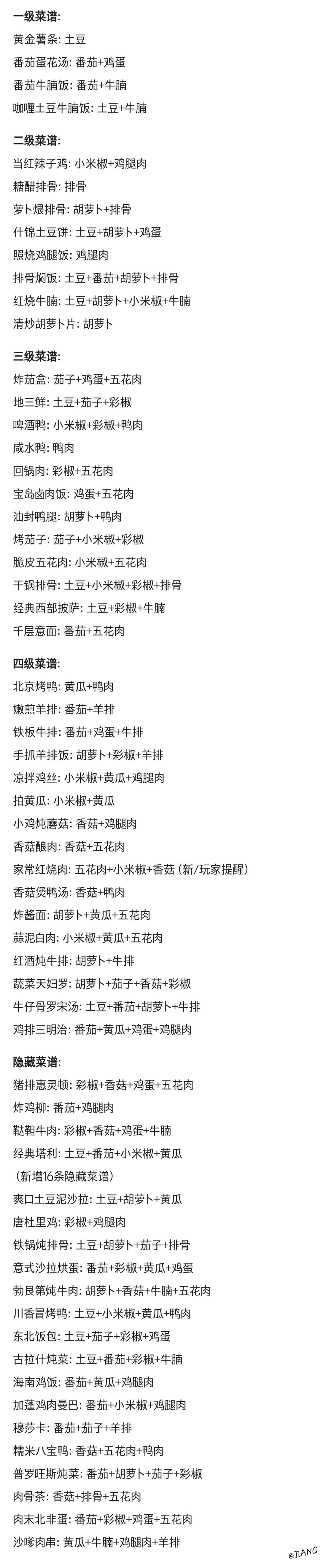 前排提醒:版本更新菜谱有所改动,如果发现需要材料和攻略不同,谨慎再次尝试。如果有玩家发现菜谱错误,及时帮忙指出,楼主会尽快改正。