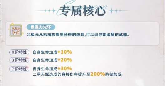 前面两阶都是单纯的生命值加成,只有七阶的时候有个特殊效果,反伤倍率提升至200%,反伤是二星才能解锁的机制,7级专属核心的效果对北极光非常重要,翻一倍的伤害倍率,让北极光输出甚至比部分输出角色还高。
