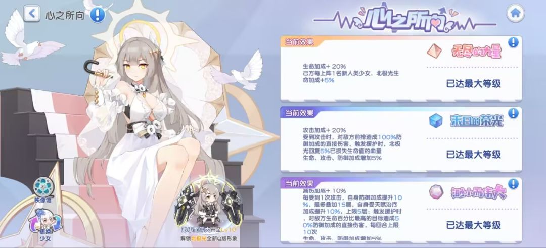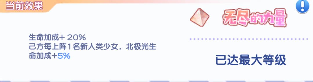 心之所向一是绑定新人类阵容的,最多提升25%生命,数值还算不错,但生命属性北极光其实并没有这么需要。