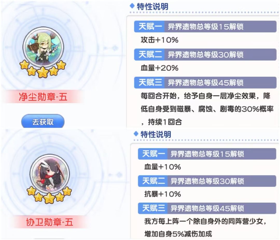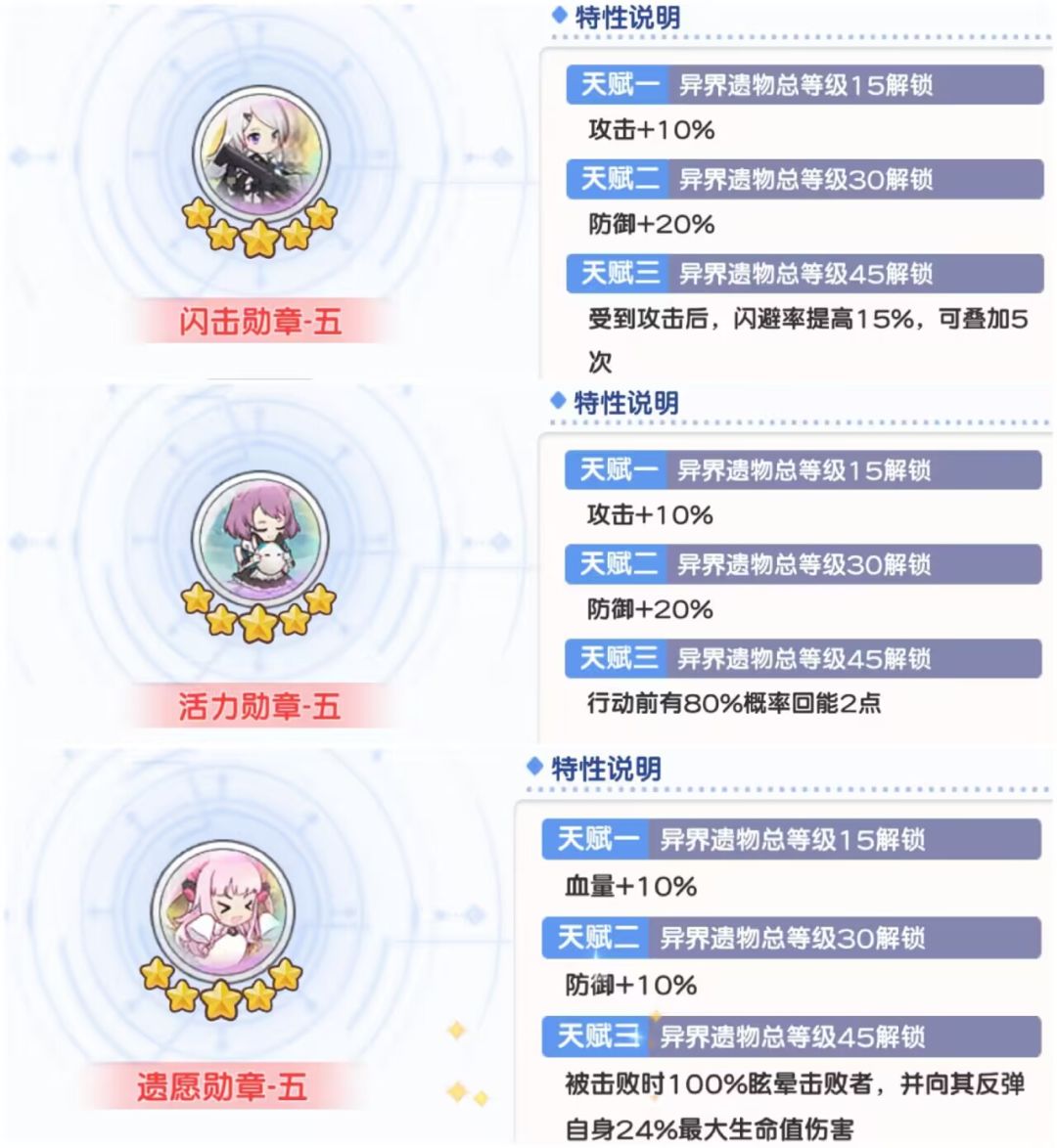 2、除此之外,万能的【协卫勋章】也是不错的,不过要11级专属核心以及绑定新人类阵容,【净尘勋章】也是需要11级专属核心,对付以毒磁伤害为核心的阵容还是不错的选择,还有可以带【反击勋章】来给无瑕叠buff,、[激励勋章]也是能够增加防御的,但触发条件麻烦。