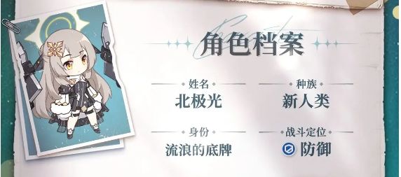 北极光属于新人类防御型少女,拥有超高额的防御力(坦度),还有援护和反伤的能力,反伤的输出数值甚至能高过部分输出角色,甚至还有给队友加攻击的辅助能力,而且北极光并没有绑定新人类阵容,任何阵容都能丢进去打反伤和援护,容错率比较高