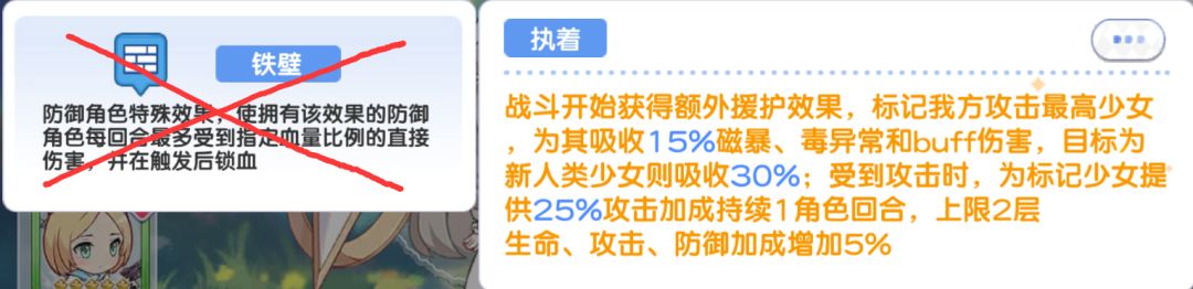 战斗开始获得额外拥护效果,标记我方攻击最高少女,为其吸收15%磁暴、毒异常和buff伤害,目标为新人类少女则吸收30%;