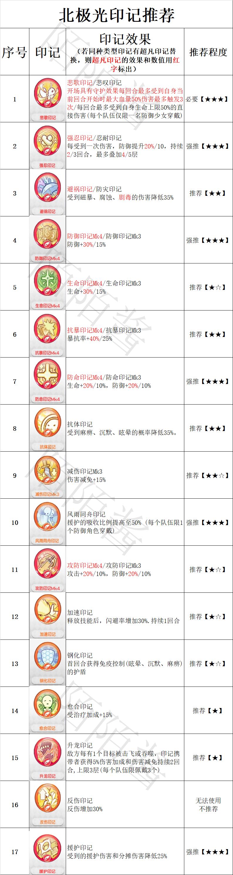 北极光属于新人类防御型少女,拥有超高额的防御力(坦度),还有援护和反伤的能力,反伤的输出数值甚至能高过部分输出角色,甚至还有给队友加攻击的辅助能力,而且北极光并没有绑定新人类阵容,任何阵容都能丢进去打反伤和援护,容错率比较高,甚至不需要很高的练度和星级,缺点就是想要造成高额反伤的话需要不错的遗物和7级以上的专属核心,并且北极光必须要携带【悲歌印记】或者【悲叹印记】,这种印记全队只能携带一个。