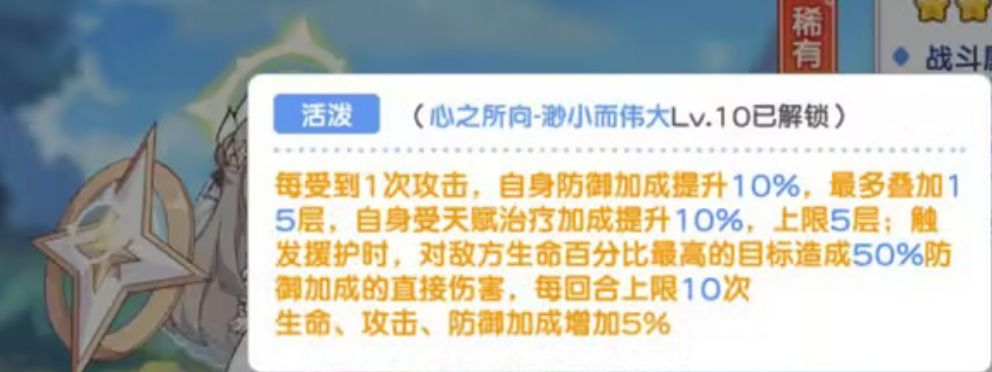 每受到1次攻击,自身防御加成提升10%,最多叠加15层(四星),自身受天赋治疗加成提升10%,上限5层;(心三)