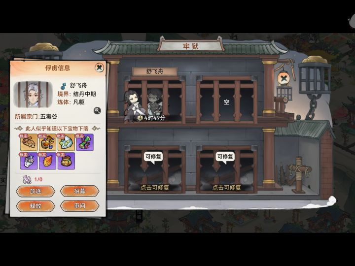 4、牢狱里优先审问,很高几率得到藏宝图,开启一个秘境(可以获得40万左右的木材/灵石等)