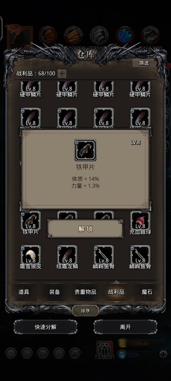 刷铁甲片建议开了魔石后到开图二十一前开刷,这个时间段刷的好处是图十六的技巧已经出了几个货了需求不是那么高了,而图二十一的战利品暂时刷不了。恰好这个时候裂隙65.69,还有图二十的邪眼巨人正好都对体质有要求,还可以提前为魔将做准备。等出了几个货之后,差不多也可以刷图二十一的战利品了