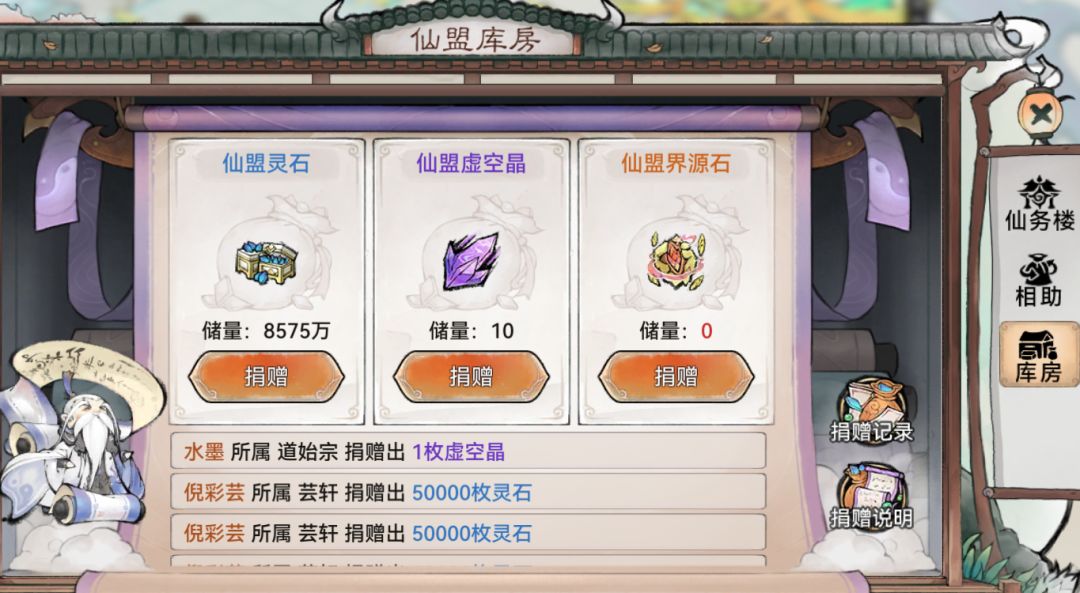 捐赠主要分为仙盟灵石,仙盟虚空晶,仙盟界源石头 注:仙盟灵活的捐赠上限是500w;仙盟虚空晶和仙盟界源石是通过山海采集获得的