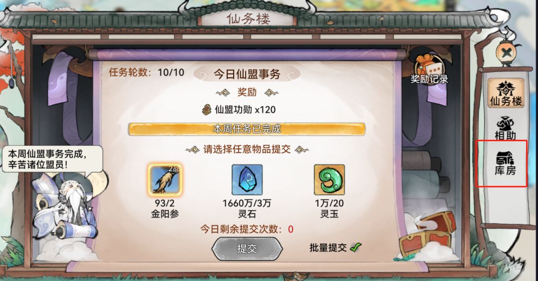 首先点开仙盟的仙务楼,你会看到新增一个图标库房