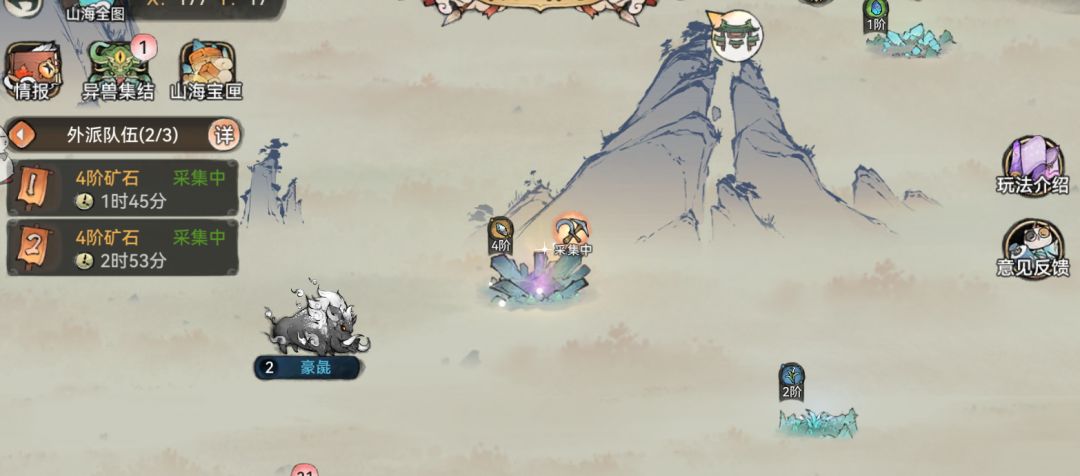 注意:山海资源点1、2、3级是5个队伍,45级是10个队伍,队伍必须是同仙盟,当同盟队伍满以后,还能去一个额外的队伍,不是同盟的就会触发对战,并不能共同采集,对战是根据战力从高到低进行战斗,全部打赢才能进行后续采集,是同盟的会因为采集满了被遣返,这样同盟的就会浪费很多路程时间。