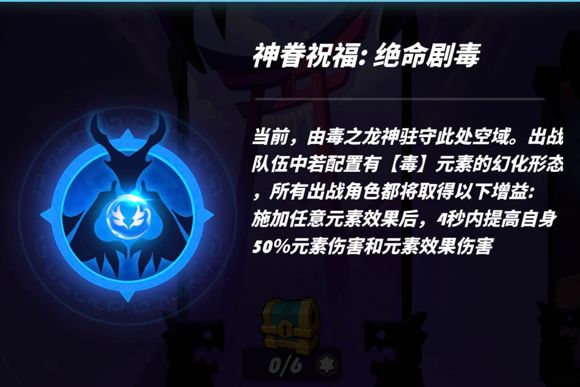 本次空域的神眷祝福:绝命剧毒,即选出毒属性的龙会为每条龙提供百分之五十的元素伤害和元素效果伤害。