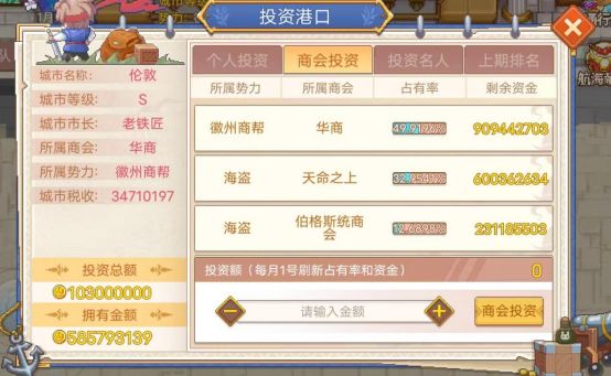 先看商会投资这栏,哪个商会排第一,哪个商会占领该城