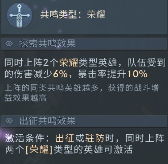 同时上阵2名荣耀类型的英雄,可降低队伍受到伤害、提升暴击率。荣耀英雄攻防兼备,一方面可提升骑兵承伤能力,另一方面可有效提高骑兵伤害输出。高文·红日高悬激活共鸣后,可额外降低敌方步兵生命值,提升队伍对敌方前排的穿透能力。