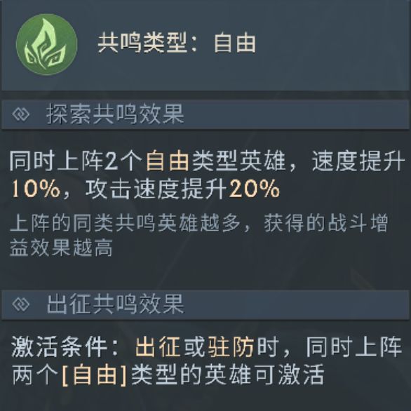 同时上阵2名自由类型的英雄,可提升队伍10%速度、20%攻击速度。攻击速度的提升,可有效提升弓兵的输出效率。在激活共鸣效果后,洛蒂涅可降低敌方骑兵攻击,减少敌方轻骑兵对己方弓兵队列的克制、冲击,提升生存空间。