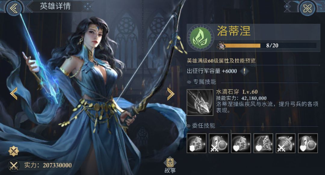 今天给大家推荐的第二位英雄是弓兵领袖洛蒂涅,洛蒂涅专属技“水滴石穿”可提升弓兵攻击、防御能力,比较适合构筑高比例的弓兵队伍。弓兵是队伍中的主要输出来源,配置高弓兵队可有效提升队伍的输出、前排击破能力。