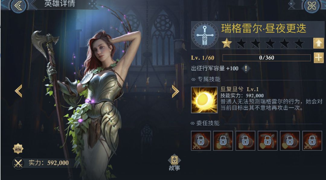 瑞格雷尔·昼夜更迭在英雄议会中可任命为统帅,为部队提供多种基础属性增益加成。其专属技能“旦复旦兮”可使骑兵每次攻击都进行额外的伤害,如果是步兵可造成6倍伤害。在激活共鸣效果后,瑞格雷尔·昼夜造成的额外伤害概率翻倍(受星级影响),在练度足够高后输出可得到质变性提升。