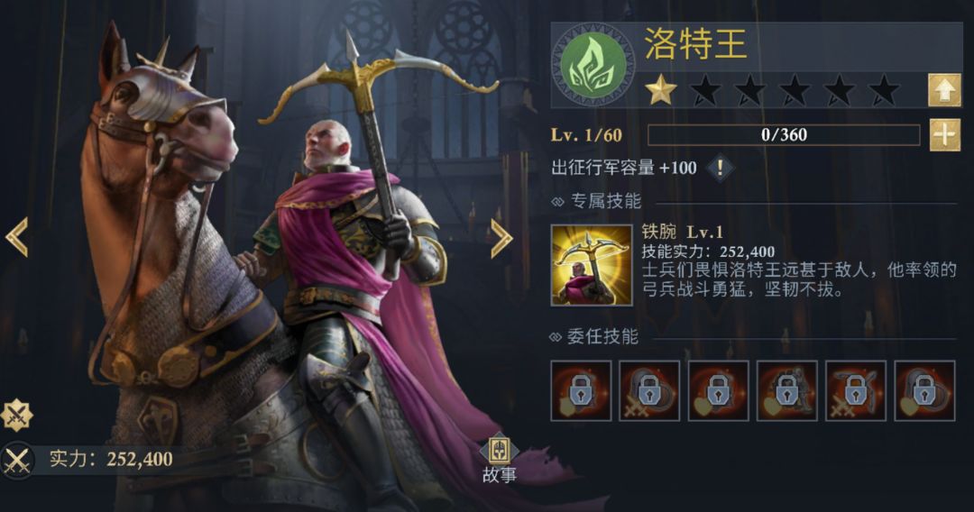 洛特王专属技铁腕可提升弓兵部队攻击、生命数值,并且在激活自由共鸣时可降低敌方骑兵攻击,从而减少敌方骑兵队对己方队伍的冲击;大埃文可使己方弓兵在攻击时概率进行仰射,对敌方目标造成额外的伤害。一个英雄提升数值,一个英雄提供额外的伤害频率,可有效提升弓兵队伍的输出。